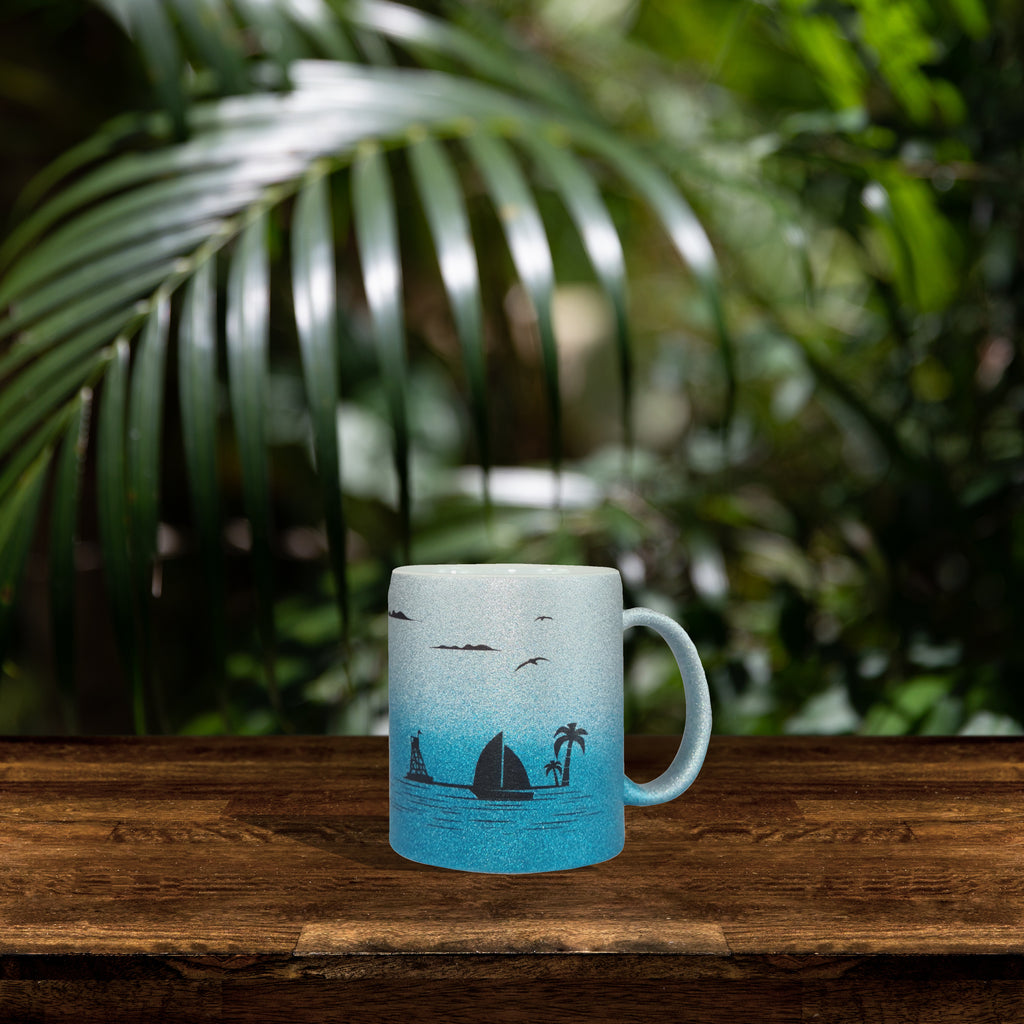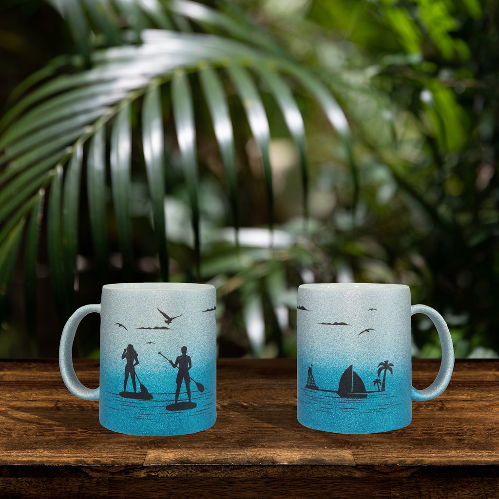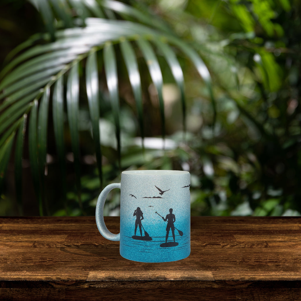 Premium grade 11oz (350ml) Silver / Blue Glitter Paddle Boarding SUP theme mug.
